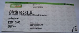 Das erste Birth rockt! fand am 21.November 2009 statt. Auf dem Flyer stand noch nicht das gesamte Lineup. Fest standen Mitch Muscle & The Motteks und WiRR. Eigentlich hätte auch Evan Freyer auftreten sollen. Dieser sagte jedoch ab und wurde durch die Band "Paranoid" ersetzt. Der Eintritt war frei, die Bands bekamen keine Gage konnten jedoch umsonst trinken soviel sie wollten. Die Veranstaltung nahm stellenweise chaotische Zustände an. Es wurden über 250 Besucher gezählt. Die kleine Kneipe war diesem Ansturm nicht gewachsen, das Einkaufszentrum Birth war gefüllt. Nach einer langen Nacht war klar, dass die Erwartungen mehr als nur übertroffen wurden und die Reihe fortgesetzt wird. Der SKFM zog nach und veranstaltete einen Monat später die "BiLo Rocknacht" im neu eröffneten Bürgerhaus Birth.
